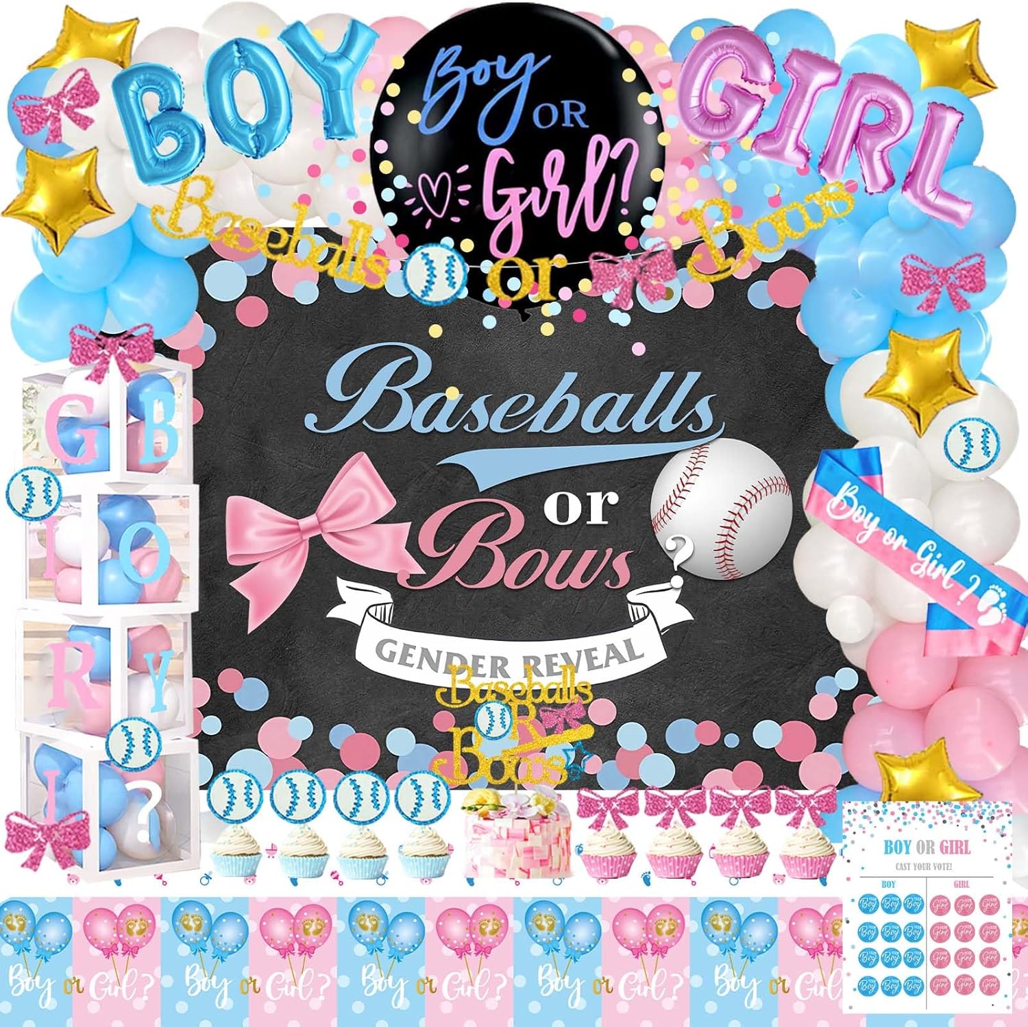 Touchdowns or Tutus Gender Reveal Decorations Kit Includes: 30 x 12’’ pink latex balloons 30 x 12’’ blue latex balloons 15 x 12’’ white latex balloons 10 x 5’’ pink latex balloons 10 x 5’’ blue latex balloons 5 x 5’’ white latex balloons 1 x 31’’ pink ‘GIRL’ foil balloon 1 x 27.5’’ blue ‘BOY’ foil balloon 1 x 39’’ ballet girl foil balloon 1 x 18’’ football foil balloon 6 x 10’’ gold star foil balloons 1 x 36’’ black gender reveal balloon 1 x pink and gold confetti 1 x blue and gold confetti 1 x backdrop 1 x ‘touchdowns or tutus’ glitter banner 1 x tablecloth 1 x cake topper 8 x cupcake toppers 4 x balloon boxes 16 x cutouts 1 x sash 12 x team girl stickers 12 x team boy stickers 1 x poster poster stand balloon strip glue dots ribbons [Tips] ① It is recommended that the balloon be inflated by 90%. ② Filling with helium makes foil balloons between 22-inch and 36-inch float. ③ Please use a balloon pump (not included) for the balloon garland. This product is from Hombae brand.