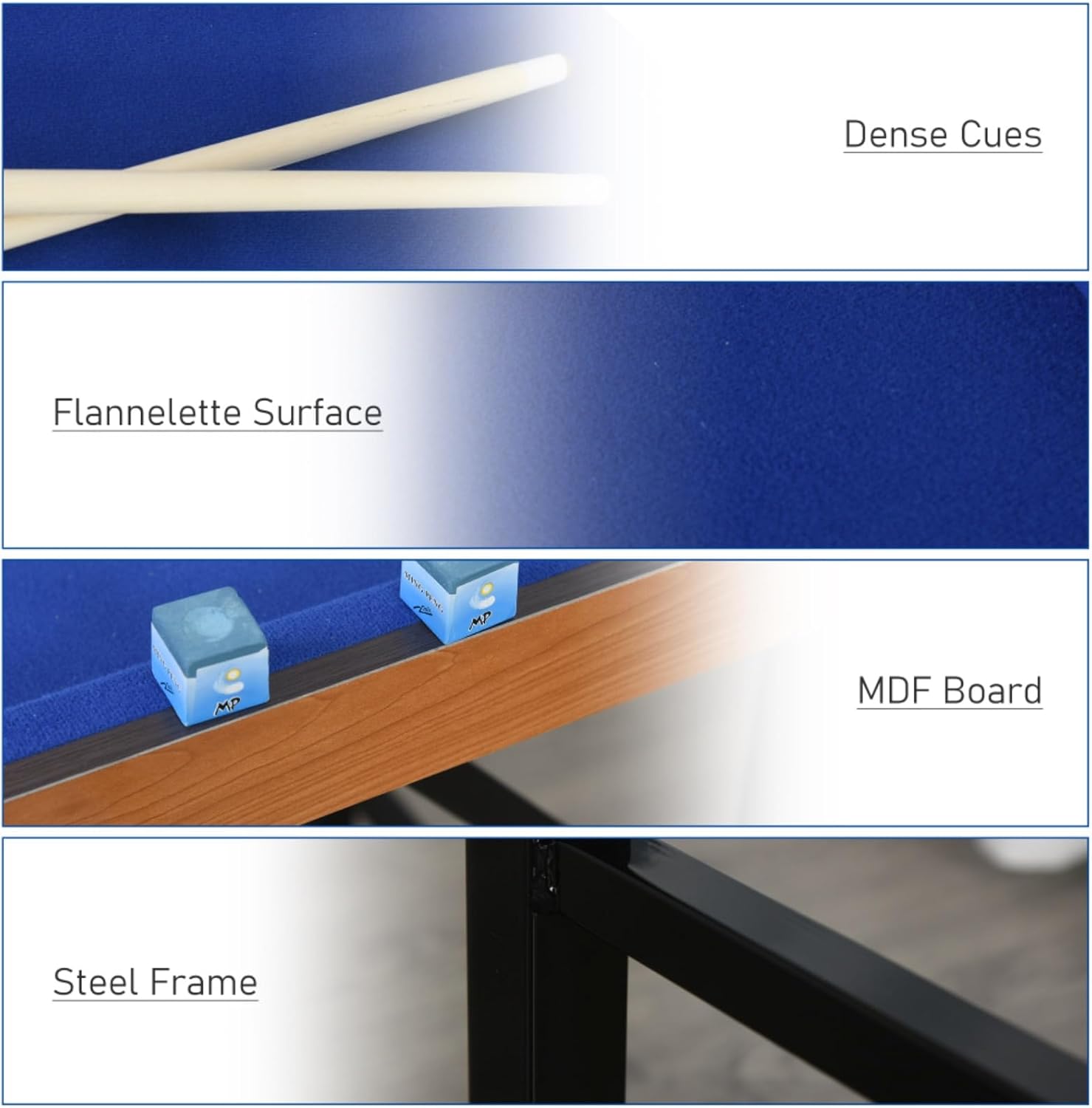 55" Portable Folding Billiards Table Game Pool Table for Whole Family Number Use With Cues, Ball, Rack, Chalk, Blue Product Type:Tabletop Billiards & Pool Main Color:Blue Main Material:MDF+Steel Product Dimensions Assembled Length(in.):55.00 Assembled Width (in.):24.80 Assembled Height (in.):29.50 Product Weight (lbs.):46.30 Package Size Length (in.): 58.30 Width (in.):28.00 Height (in.):4.90 Weight (lbs.):50.70 Decorative and Practical:This simulated billiard table model can be used as a mini billiard table, desktop ornament to decorate your home or office, and ideal gift for billiard enthusiasts Durable & Sturdy Build – This mini pool tables for adults and kids is designed with strong materials to withstand intense games Great Gift Idea – A fantastic choice for billiards lovers of all ages, from a kids pool table to a mini billiards table for casual players and beginner.