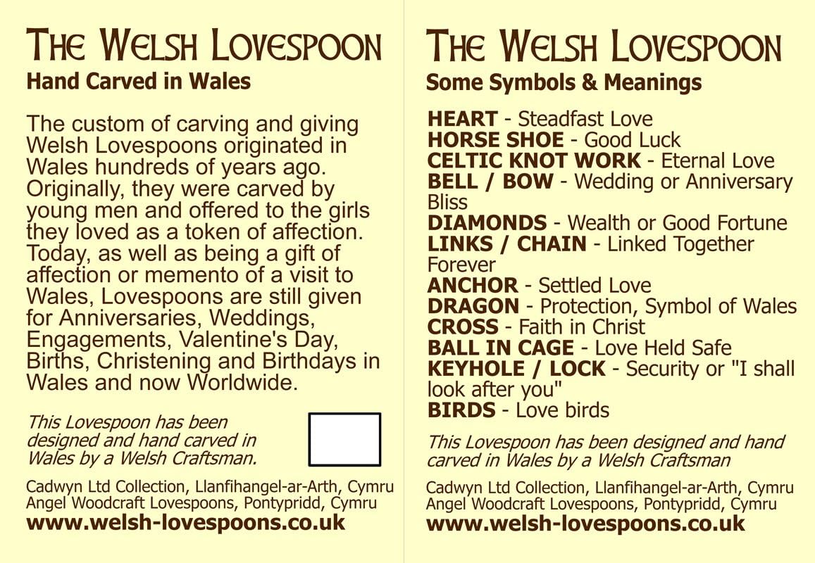 In these days of mass-produced gifts, people are searching for Romantic gift Ideas that are unique as gifts of love for special people in their lives, and a Welsh Love Spoon is the perfect answer. The custom of carving and giving Welsh Lovespoons originated in Wales hundreds of years ago. The young men of today would probably buy flowers, chocolates or jewellery as a token of affection. Centuries ago in Wales, the young lover would give a special, more personal gift to the object of their desire, the Welsh Love Spoon. Some of the early love spoons can be seen on display at the Welsh Folk Museum in Cardiff. There is even one that dates back to 1667. The Cadwyn range of spoons are the creations of a group of wood-carvers in the southern valleys of Wales, led by Paul Curtis. When he was sixteen a good friend, Ceris Williams, took him to visit a highly acclaimed master craftsman called Gwyndaf Breeze at St. Fagons Welsh Folk Museum in Cardiff. Gwyndaf taught Paul how to make a Welsh lovespoon and told him about the history. When he was leaving, Gwyndaf encouraged Paul to make a spoon by kindly giving him some pieces of various hardwoods. With a piece of the hardwood Paul made his first lovespoon and gave it to Ceris. Today Paul's lovespoons are much sought-after all over the world. When Paul makes a spoon, firstly the wood is selected and cut to a manageable size. The wood usually used is Limewood sourced from Monmouthshire, south Wales. The wood is pale in colour and very uniform in character. It is lighter and easier to carve than walnut or oak, it is easily worked, and has very little grain. Next the design is drawn onto the wood and the basic shape of the spoon is cut out. Once he has hand carved the spoon it is sanded three time with different grades of sandpaper and polished twice with beeswax.