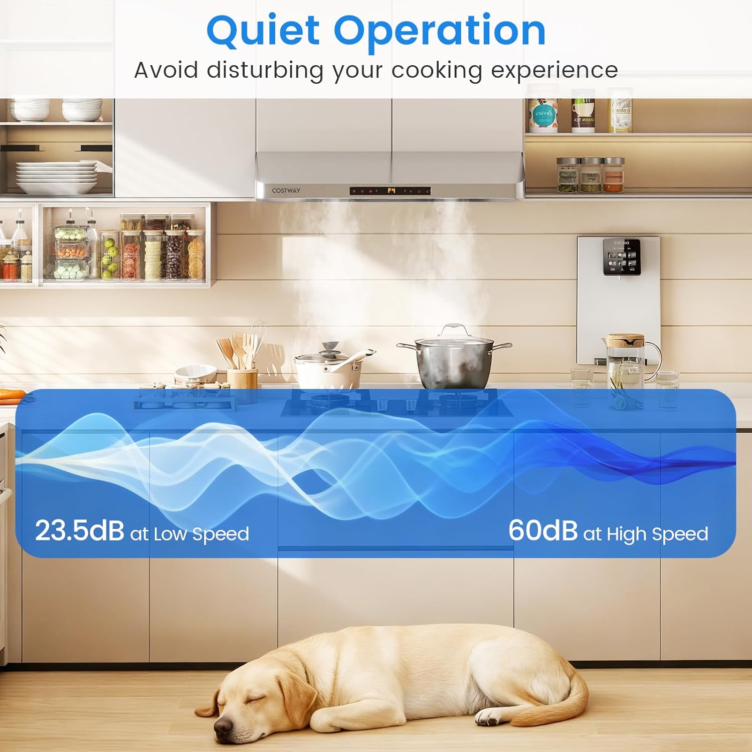 Experience the ultimate cooking environment with this stove hood.This kitchen exhaust hood offers a maximum airflow of 900 CFM with dual powerful motors and 4 adjustable fan speeds to efficiently remove smoke. It operates quietly between 23.5 to 60 dB and provides flexible installation options, including a 6'' round top vent for standard ducts and 2 rectangular adapters for rear-duct setups. Equipped with 2 adjustable LED lights, this range hood ensures excellent visibility over your cooking area. The hood vent for kitchen features versatile touch, gesture and remote controls along with a 15-minute timer and 3-minute delay-off timer for added convenience. Additionally, dishwasher-safe baffle filters and a removable oil collector make maintenance hassle-free, keeping your kitchen cleaner and air fresher.Features:900 CFM powerful airflow for effective smoke removalAllow for customizable ventilation levels with 4 fan speedsQuiet operation occurs with noise as low as 23.5 to 60 dB Flexible installation is available with a 6” round top vent for standard ducts 2 rectangular adapters are included for rear-duct setups, allowing easy installation 2 adjustable LED lights provide bright illumination over the cooking area Touch, gesture and remote controls allow easy operation for user convenience Timers of 15 minutes and 3-minute delay-off enhance automation and energy saving Dishwasher-safe baffle filters make cleaning simple and efficient A removable oil collector for easier maintenance and longer hood lifeMake it safe to use with ETL certificationSpecifications:Color: SilverMaterial: Stainless Steel, Galvanized Steel, MetalOverall Dimensions: 35.4” x 19.7” x 7”/90 x 50 x 18 cm (L x W x H)Recommended Mount Height: 24”-30”/61-76 cmVenting Size: Top Vent, 6” RoundNet Weight: 45 lbs/20.5 kgPower: 256WVoltage: AC 110-120VFrequency: 60HzMaximum Airflow: 900 CFMNoise Level: 23.5-60dBIllumination: LED 3W 12VInstallation Method: Under CabinetControl Type: Gesture/Touch/RemotePackage Includes:1 x Range Hood1 x Remote Control1 x Round Adapter2 x Rectangular Adapters1 x Instruction