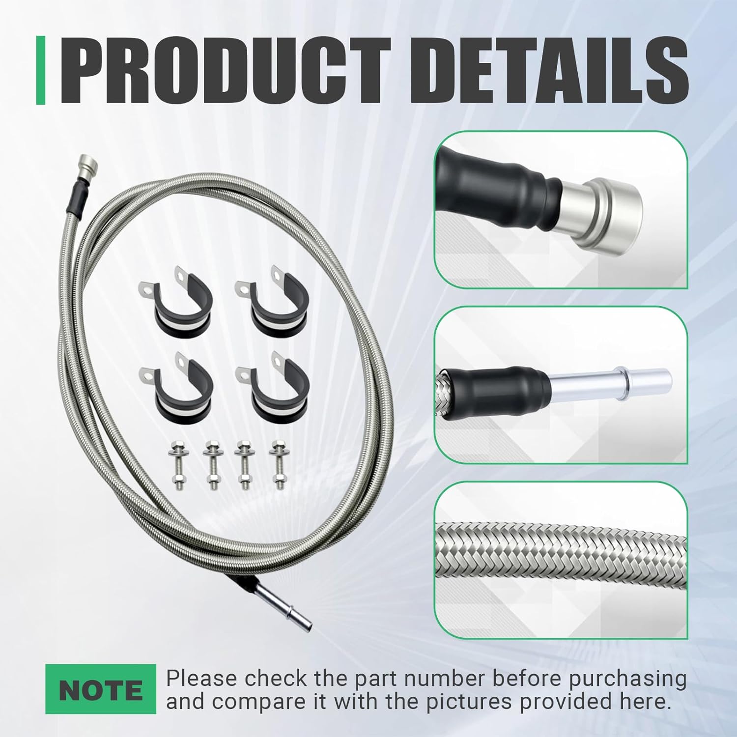 | Included Components | 2 x Flexible Stainless Steel Braided Fuel Line 8 x Steel/Rubber clips 8 x nut and screws |