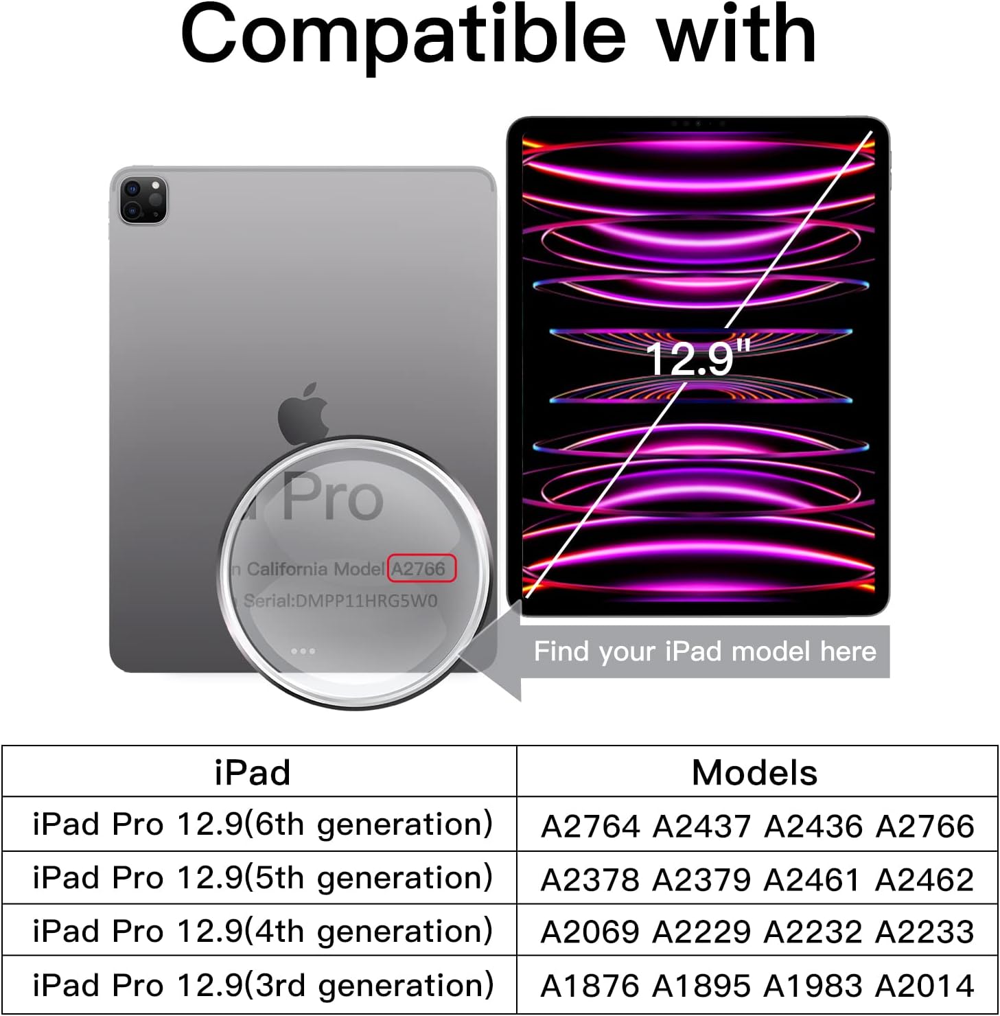 | Compatible Devices | iPad Pro 12.9 Inch 3rd generation 2018 (Model: A1876 A1895 A1983 A2014), iPad Pro 12.9 Inch 4th generation 2020 (Model: A2069 A2229 A2232 A2233), iPad Pro 12.9 Inch 5th generation 2021 (Model: A2378 A2379 A2461 A2462), iPad Pro 12.9 Inch 6th generation 2022 (Model: A2764 A2437 A2436 A2766) |