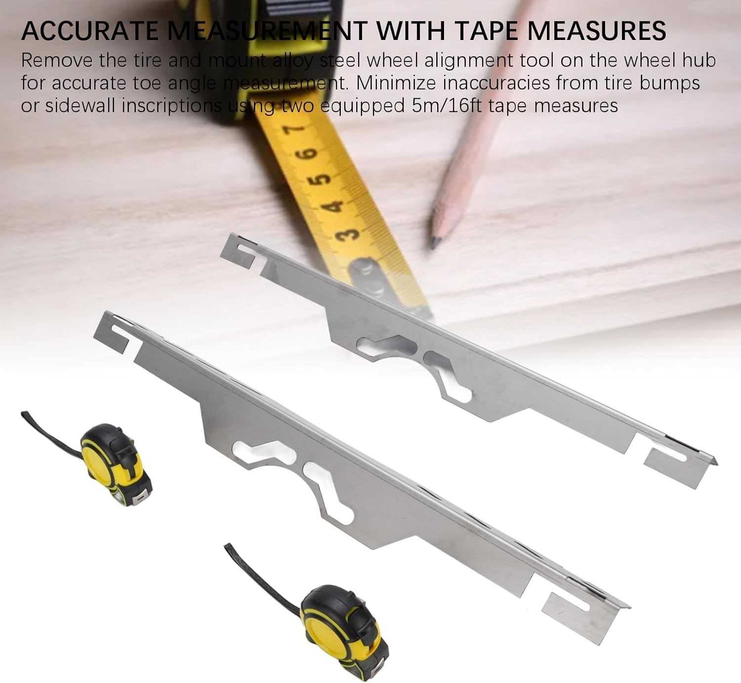 1. ACCURATE MEASUREMENT WITH TAPE MEASURES: Remove the tire and mount alloy steel wheel alignment tool on the wheel hub for accurate toe angle measurement. Minimize inaccuracies from tire bumps or sidewall inscriptions using two equipped 5m/16ft tape measures 2. STRONG STEEL CONSTRUCTION: Toe alignment tools use quality steel with a black coating to prevent deformation, and high hardness steel plates enhance durability, increasing the lifespan and reliability of the tool 3. SAFE PREVENT FALL SLOTS: Alignment toe plates feature a unique groove and suspension design that holds the tape measure top securely in place. Prevents the tape measure(not included) from moving during single person measurements, ensuring a high success rate and promoting efficient single person operating, and allows for convenient wall mounted storage 4. WIDE COMPATIBILITY: Toe plate wheel alignment tools are designed with universal holes to accommodate a variety of wheel sizes, making them suitable for a variety of vehicles including scrambling motorcycle, UTV, ATV, etc. 5. COMPLETE KIT:Wheel alignment tool kits includes 2 heavy duty wheel alignment tools, and 2 5M/16FT tape measures, provide great convenience for your work Spec: Item Type: Wheel Alignment Tools Material: Alloy steel Features: Wheel hub alignment tool is made of quality steel with a black coating to prevent deformation, high hardness steel plate enhance durability, prolong the tool lifespan and reliability Size(LxWxH): Approx. 60 x 6 x 5.3cm / 23.6 x 2.4 x 2.1in Color: Silver How to Use: Take out the product and install, then you can use. Package List: 2 x Wheel Alignment Tools 2 x Tape Measures