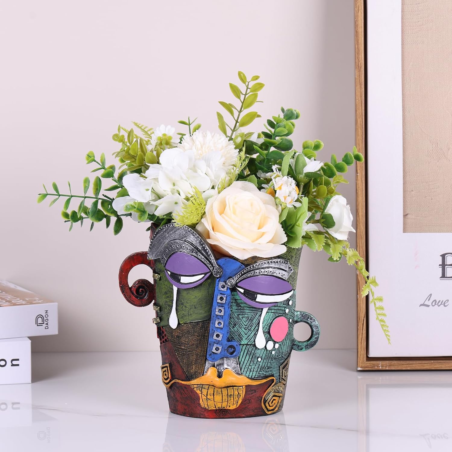 Add bold character to your space with this abstract flower pot, a vibrant and artistic face vase that doubles as a planter and a statement piece. Its colorful pot design combines retro aesthetics with modern flair, making it perfect for home decor or as a decorative accent on your patio. Ideal for indoor plants large or small, this funky art planter showcases intricate details and playful expressions, bringing a touch of humor and creativity to your surroundings. Whether used as a smiley face planter pot or a head-shaped flower pot, it’s a unique, eye-catching addition. Great for art enthusiasts, this funny, colorful plant pot also makes a thoughtful gift for those who love unconventional designs.