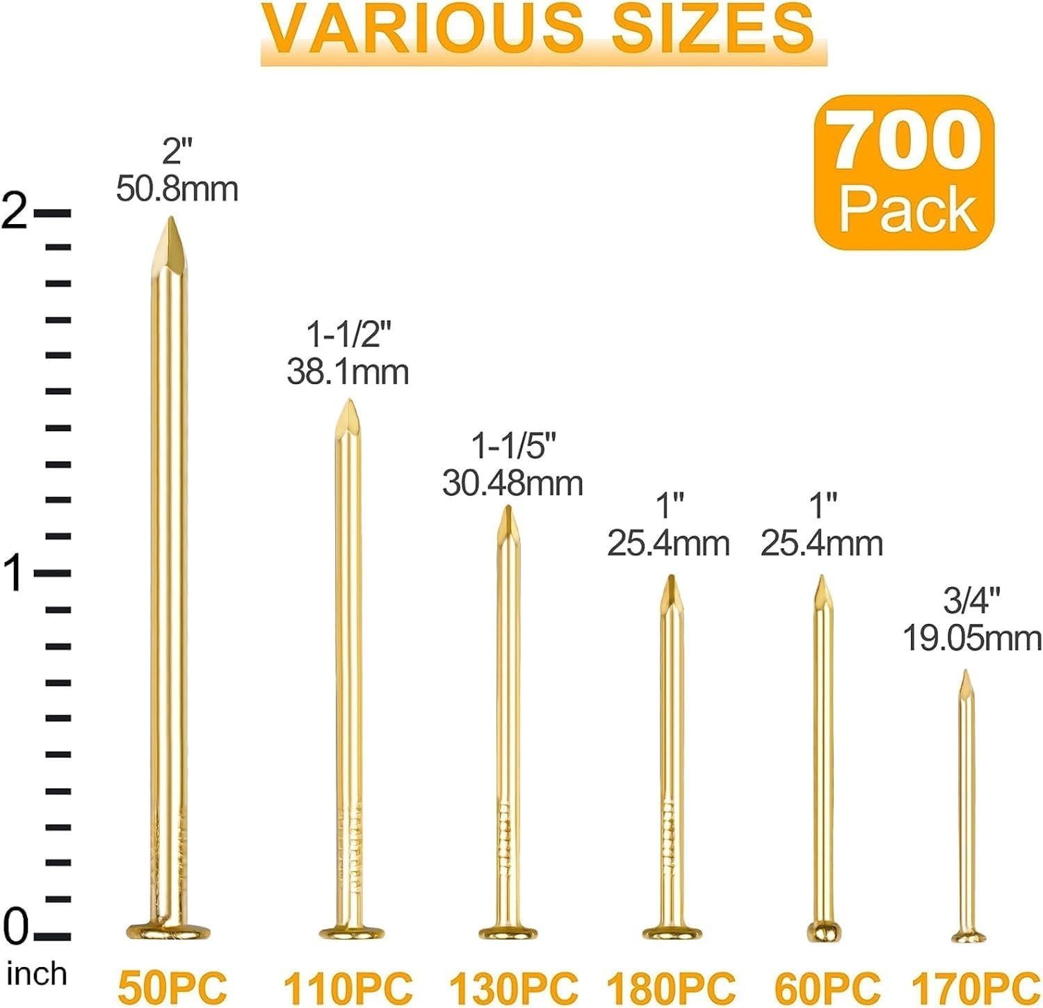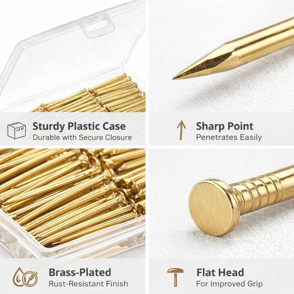 Transform your home decor effortlessly with our premium gold nails designed for picture hanging. These versatile nails are the perfect solution for displaying photos frames and art while adding a touch of elegance to your walls. Made from high-quality carbon steel they offer durability and strength ensuring they hold up beautifully over time.Each set comes with an assortment of sizes allowing you to choose the perfect nail for any project. The galvanized finish not only enhances the aesthetic appeal but also protects against rust and corrosion ensuring years of reliable use. The transparent storage box organizes the nails neatly providing easy access and saving you time during your creative endeavors.Whether you are a DIY enthusiast or a professional decorator these nails cater to all your hanging needs. Their sharp tips allow for easy insertion into walls and wooden surfaces making them a must-have for every toolbox. Perfect for home improvement projects or artistic displays, they help you achieve your design vision with minimal effort.Package Includes: 1*Gold Nails Set
