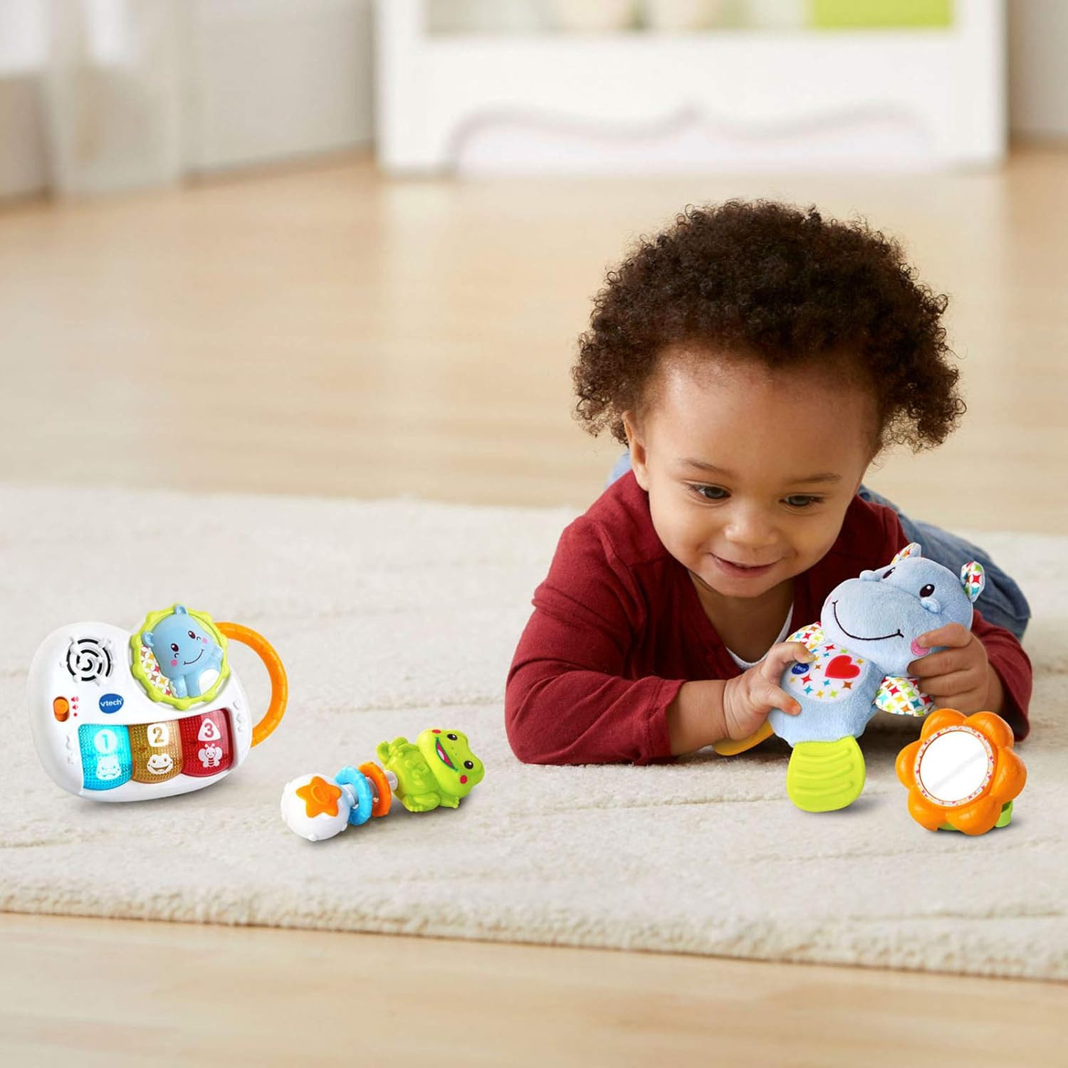 | Included Components | Newborn Necessities Gift Set (light-up piano, plush hippo, frog rattle, peek-a-boo flower mirror), Parent's Guide |