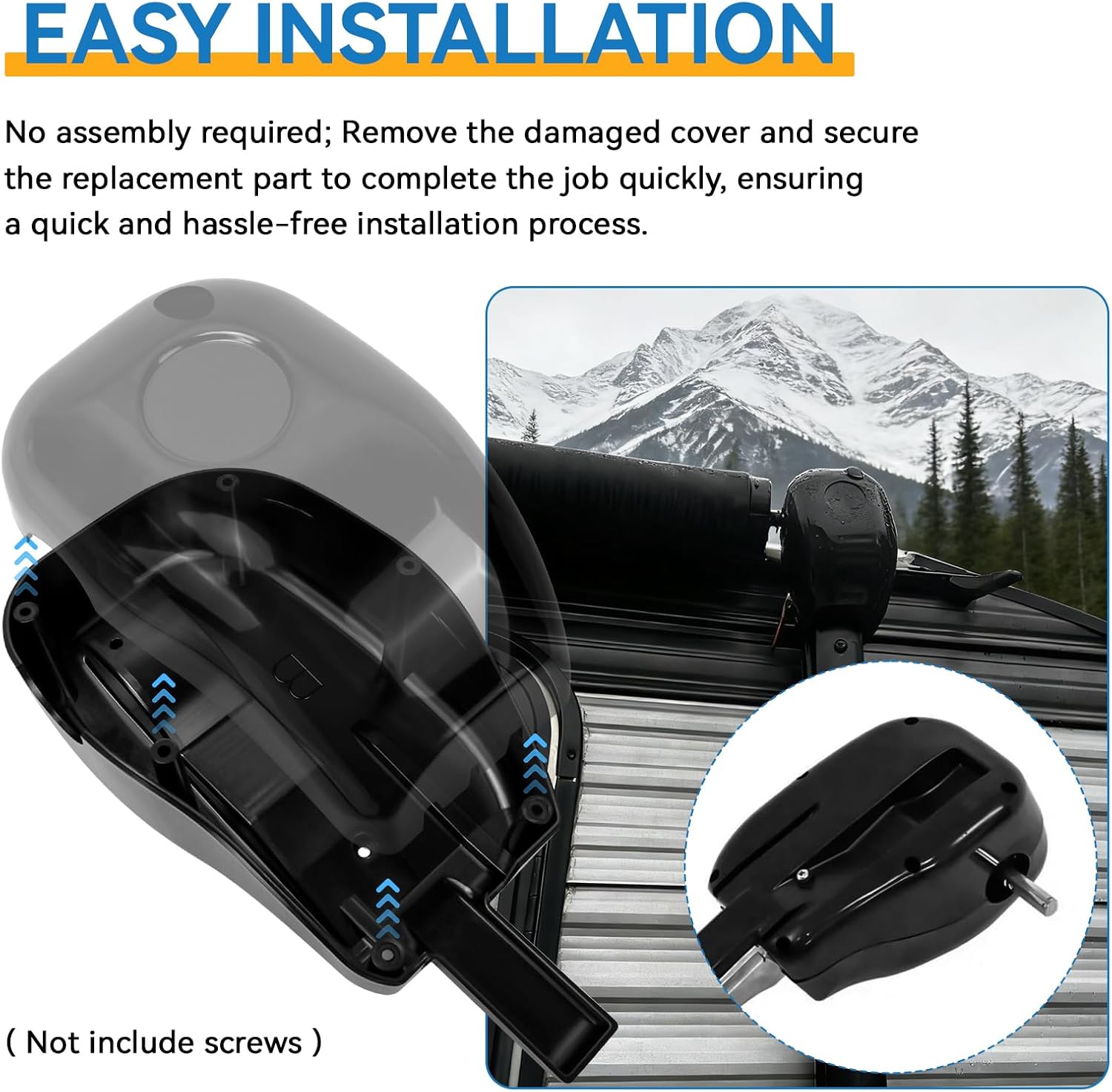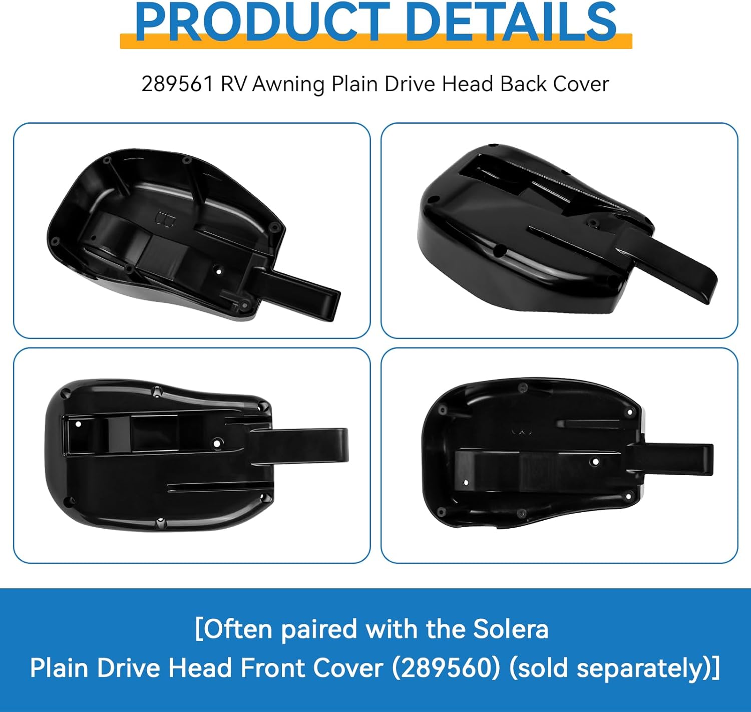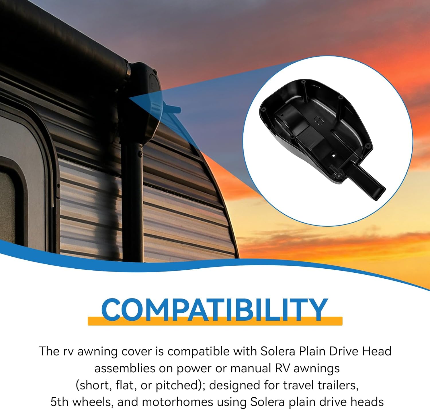 The 289561 rv awning motor cover is universal for Solera Plain Drive Head assemblies on power or manual RV awnings (short, flat, or pitched); designed for travel trailers, 5th wheels, and motorhomes using Solera plain drive heads Rv awning end cap replacement is made of ABS material, high strength, impact resistance, light weight, can better adapt to changes in the outdoor environment, product life longer. The rv awning cover replacement is durable, and easy to install to protect the drive head assembly from outside elements and debris. Upgrade your motorhome awning with this stylish and convenient rv awning motor cover. It adds a touch of elegance to your RV while providing practical protection, making every camping trip more enjoyable!