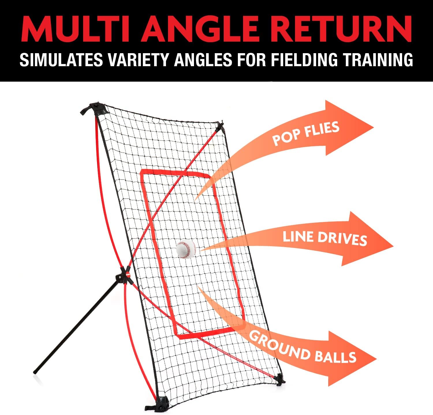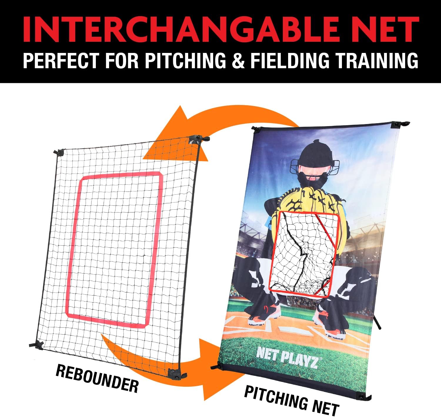 Net Playz 5 x 3Ft Foldable Baseball 2 in 1 Rebound and Pitching net. Featuring interchangeable net provides you with a target that you can use to improve your pitching accuracy, and a rebound net for you to improve your fielding skills. Great for the pitcher in developing pitching and fielding. Featuring ball collection design, there is a ball collect zone at the center, to let you easily collect them. Spend less time chasing balls and have more time improving your skills. With flexible yet strong fiberglass poles, nets can be set up or folded in minutes without any tools. Easily being folded into a compact size makes it perfect for indoor storage. Store it indoors help minimize the risk of being damaged by weather, and also enhances the durability of the net at the same time. Comes with 3 adjustable angles make it able to return ball in various angles for fielding training such as pop flies, line drives and ground balls. Ideal for personal training and solo game for any practice or recreational use.The perfect practice companion in the backyard for future sport stars for both children or youth. Best backyard baseball net for players of all abilities to boost their baseball skills. Also suitable for fielding use. Product Details Target Panel x 1, Rebound Net x 1, U-shaped Ground Peg x 1, Carry Bag x 1, Instruction x 1,Open Size (L x W x H): 5 x 3 X 3 Ft,Folded Size (L x W x H): 41 x 7 x 7 inch