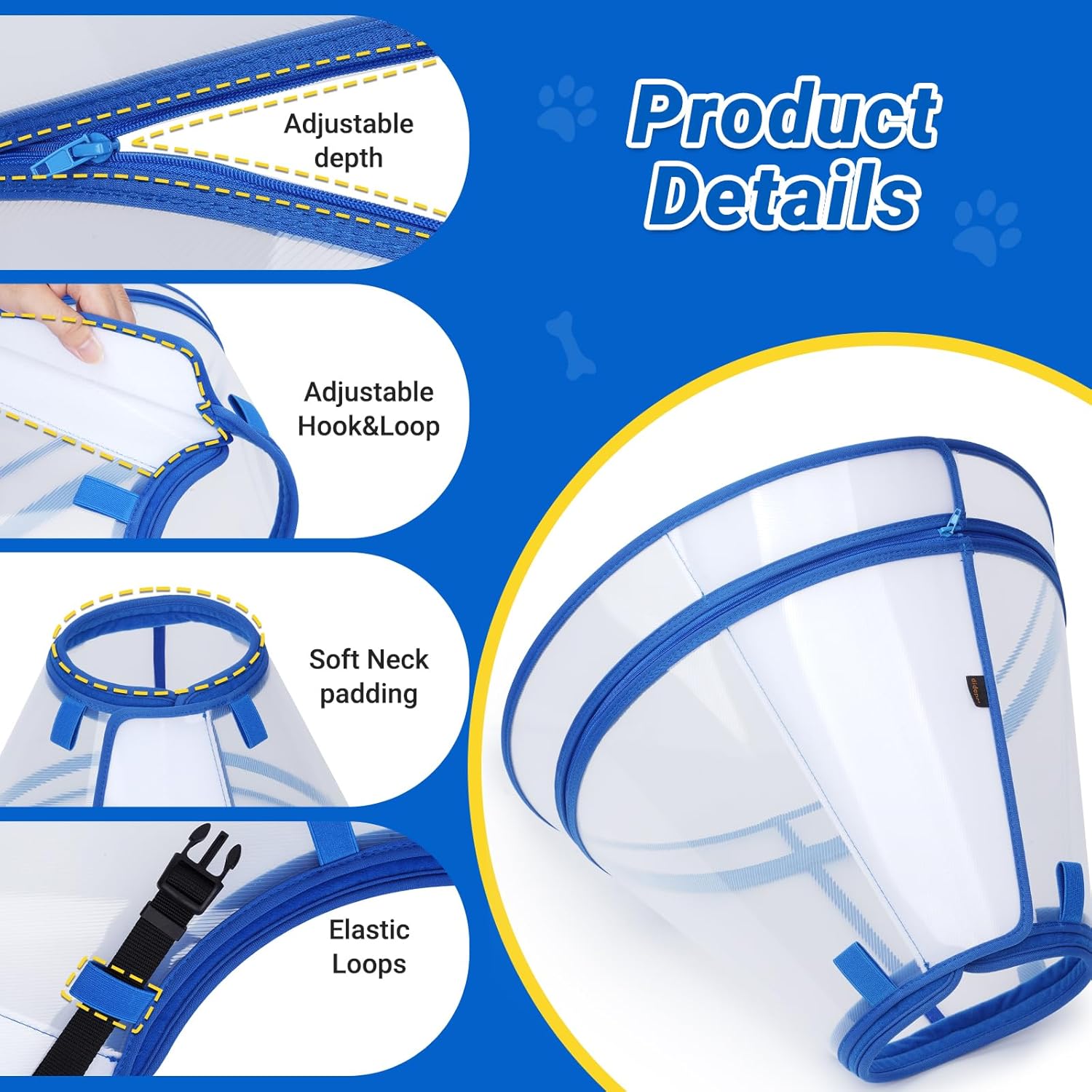 | Recommended Uses For Product | Do not pull the zipper forcefully. If your dog tries to chew on the dog cone, redirect their attention with treats or toys. Place the hook-and-loop fasteners at the back of the neck to prevent slipping. Always stay vigilant and provide proper care to ensure smooth recovery without complications., Even with the correct fit, dogs may still lick wounds due to bad habits or special circumstances. Check the elizabethan collar regularly for wear or injury and monitor your dog, especially during the first adjustment period. Keep the hook-and-loop fasteners clean with a soft brush or lint roller to maintain their effectiveness. |