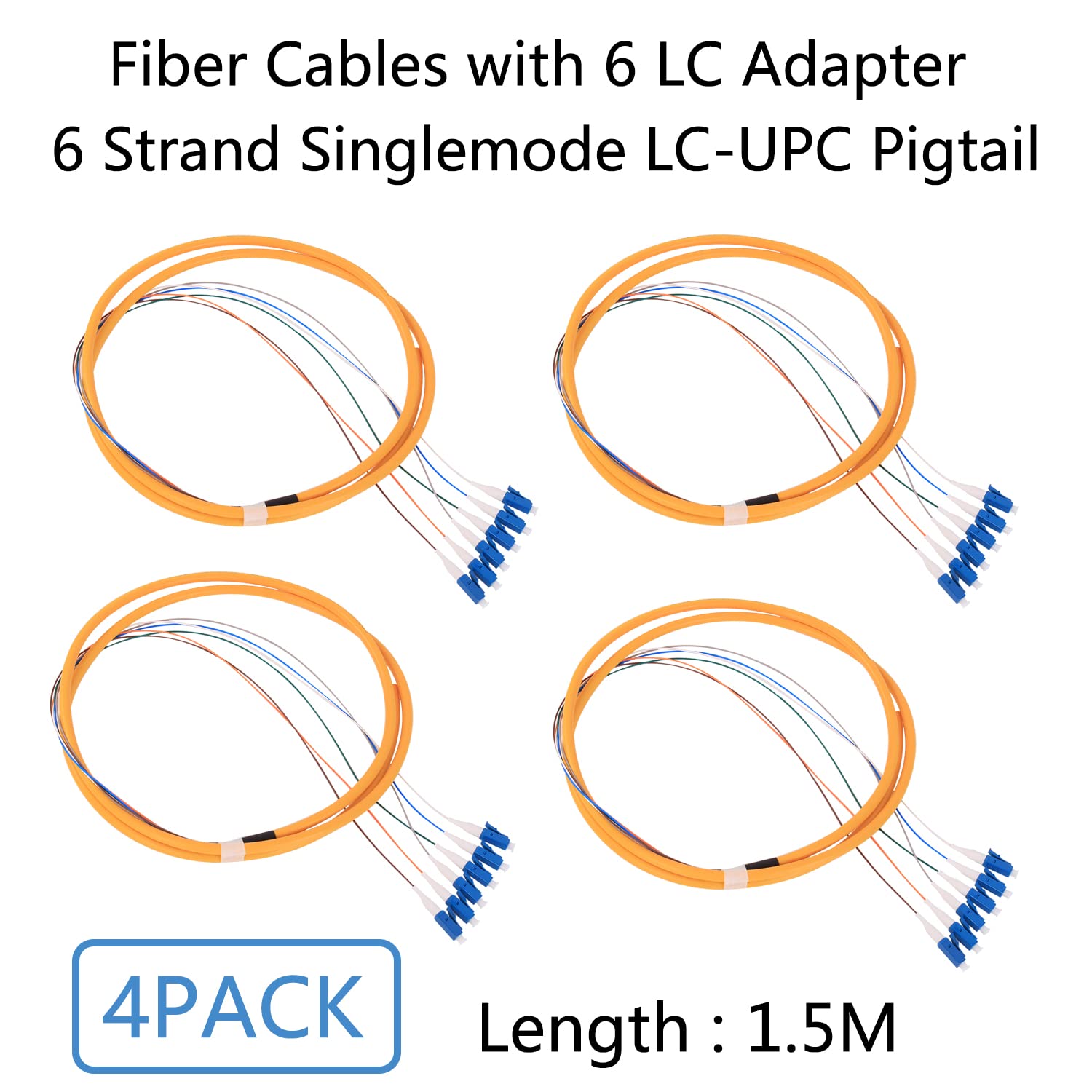 4PCS 1.5M Singlemode LC/UPC Fiber optic pigtails Cable are great for fusion splicing inside of a fiber optic enclosure. Each strand is terminated on one end and the other end is left blunt so that it can be spliced to your drop cable to eliminate the need of pesky field terminations. Specification 1.Excellent Feature: Lower Insertion Loss, High Return Loss, Environmentally Stable & Repeatability;All fiber bushing are made of high quality porcelain so that fiber tail cable and patch cord of any configuration can make optical signal loss very small. 2.Fiber pigtails are machine polished, and the result is a much lower light loss than can be achieved by hand polishing in the field. 6 Color Mark 1.Splice-ready 900um buffered cables are color-coded according to industry standards for easy identification and the pre-terminated connectors at the opposite end are machine polished for optimal performance. 2.Each cable is fully inspected and contains a test report. Our pigtails are also available with different connectors, polishes, strand counts and styles; like armored and waterproof. Parameters 1.Fiber Typ: Single-Mode, Connector (s): LC Connector, Cable Length: 1.5M; Minimum Bending Radius: 3.8cm. 2.Ferrule material: ceramic; Working Wavelength: 1310-1550nm. 3.Insertion loss: ≤0.3; Plug: Ceramic Ferrule; Echo wear: ≥ 50; Tensile type: 4KG. 4.Interchangeability: Operating temperature: -40 ~ +80; Storage temperature: -40 ~+85; Number of plugs: ≥1000. Application Telecom and Datacom, Storage Network, CATV & Multimedia Application, Systems Integration for Long Haul, Metro and Access Network, Fiber to the Indoor (FTTX) Test. Package Included4Pack: 1 x 6 Strand Fiber Optic Pigtail with 6 Strand LC-UPC Cable Connectors which connect to the end equipment, like an adapter panel or optical transceiver.