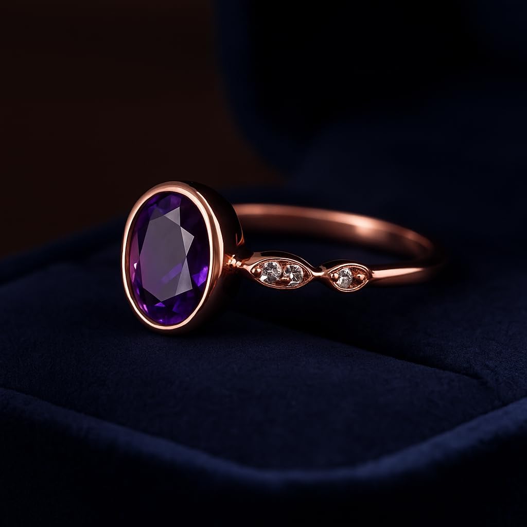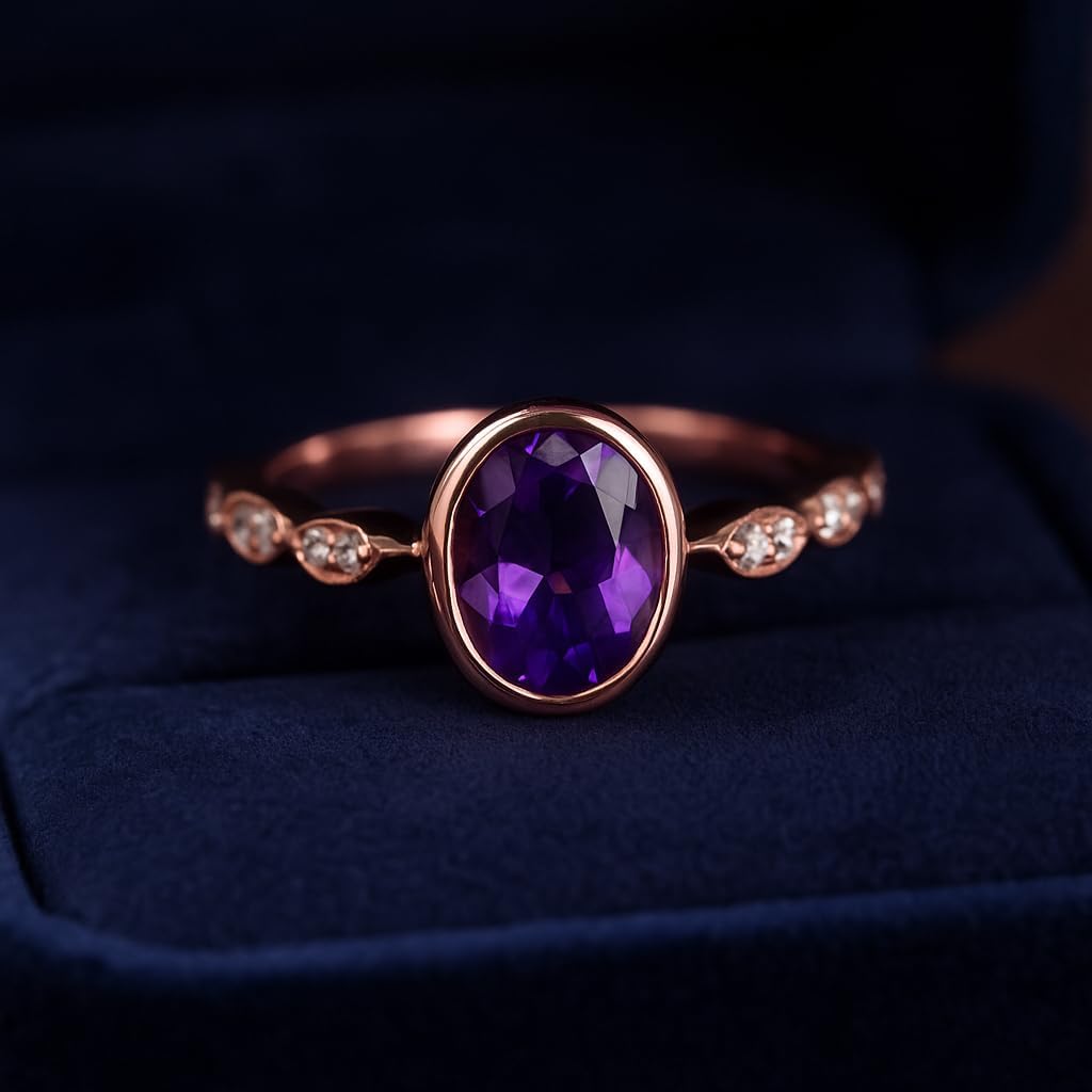 This elegant oval amethyst gemstone ring is designed for women who appreciate understated luxury. The vibrant purple amethyst is framed in a sleek bezel setting, giving the ring a clean and contemporary feel, while delicate diamond accents add a soft sparkle along the band. Finished in a warm rose gold tone, this ring transitions effortlessly from everyday wear to special occasions. Whether chosen as a birthstone ring, personal statement piece, or elegant gift, it reflects calm, creativity, and timeless beauty. A graceful blend of color, craftsmanship, and modern design.