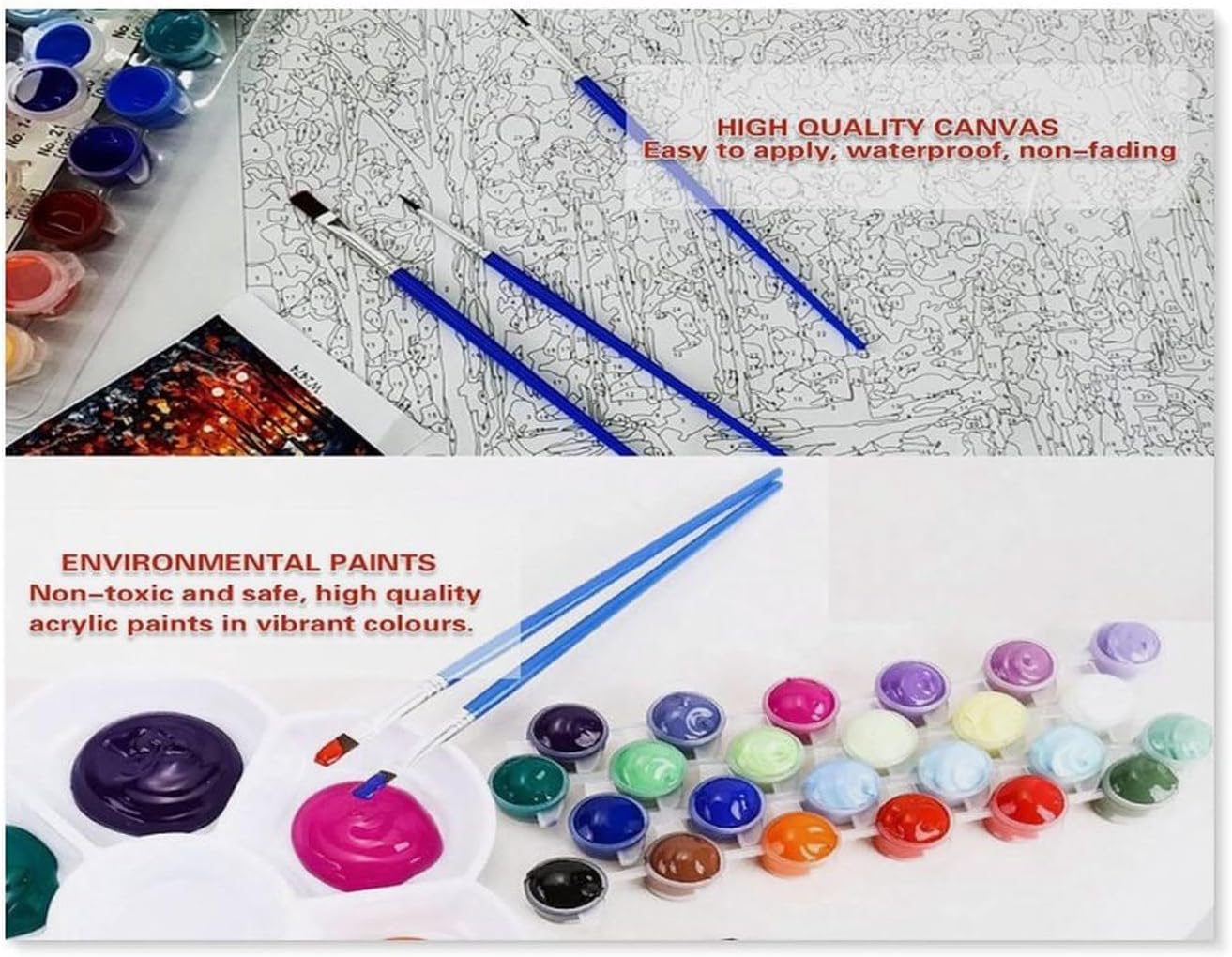 Paint Specification: Size:40*50cm Package included:1pc pre-printed textured canvas (without framed), 1 set acrylic pigment, 3pcs professional brushes. Warm Tips: 1.Please use the paint directly and do not add water. 2.Fill the colors with the match numbers on the canvas and if you fill in wrong color, just waiting it dry and use the correct color to cover it. 3.Pigments maybe dry easily, so please open one color at a time, but if there is a bit dry, you can drop 1 to 2 drops of water into it and stir, will not affect the normal use. 4.The paints we offer is enough for the normal use, please do not waste it in case of the paint shortage. 5.The pigment is rapid drying. Make sure cover the lid when you don’t use it. 6.For the white paint and other light color paint part, the figures left on the canvas may be seen, you can double use the paint and try to cover with the thick paint.