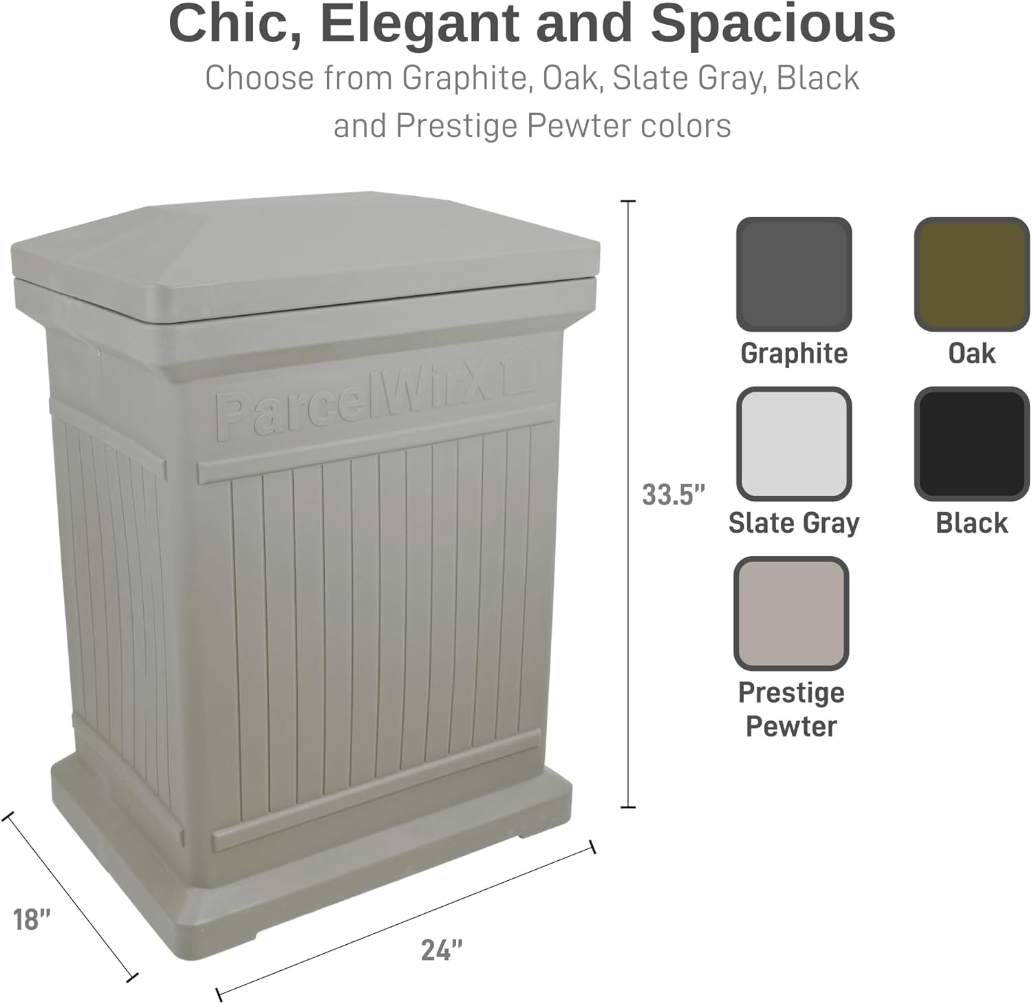 The RTS Home Accents ParcelWirx Premium Vertical Package Delivery Box offers a secure and convenient solution for receiving packages at your home. Designed to protect your deliveries from the elements and theft, this durable storage box is crafted with high-quality materials for long-lasting use. The vertical design provides ample space to accommodate various package sizes.The lift off lid makes it easy to access your packages, and its weather-resistant construction protects against rain, snow, and sun damage. With a sleek, modern design, this storage cabinet blends seamlessly into any outdoor setting, adding both functionality and style to your entryway or porch. Perfect for keeping packages safe and organized, the ParcelWirx delivery box is the ideal solution for today’s busy homeowner.