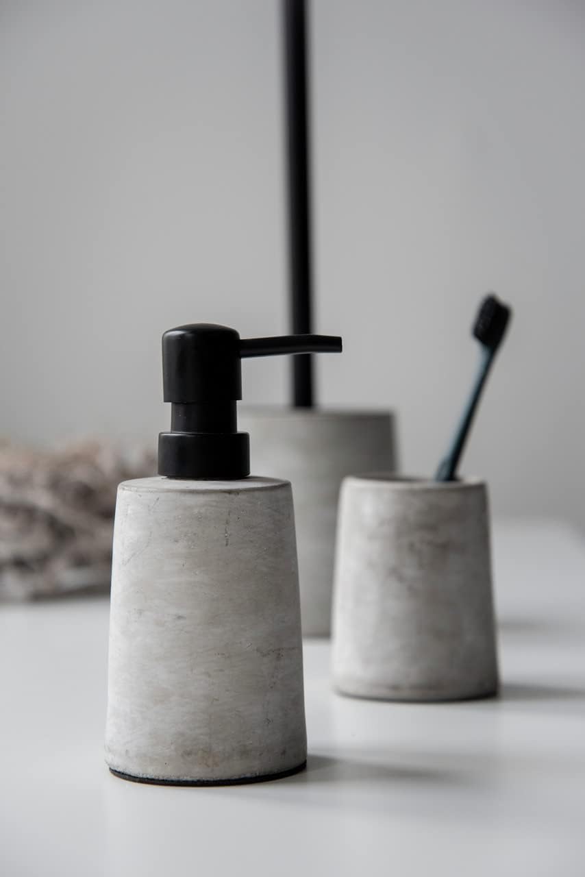 The bathroom series Villena by Wenko made of sturdy concrete is reminiscent of the monumental buildings of Greece due to its robust and natural look. Create a divine appearance of your bathroom and create a room full of impressive impressions. The opulent toothbrush holder made of durable concrete offers both the electric toothbrush and your toothpaste a non-slip and secure stand. The spacious container with a diameter of 7.4 x 9.5 cm gives your dental care utensils a tidy place and due to its neutrality, the toothbrush cup fits very well into the existing interior. The attractive cup in grey is ideal for positioning on the sink, so you have the products for dental care always at hand. In the guest toilet, the beautiful accessory also comes into its own. On your bathroom shelf, the toothbrush cup is also a decorative highlight and is ideal for storing make-up brushes and make-up. Wenko and the Villena bathroom accessory series take you and your guests on a stunning trip to the Mediterranean. Complete your bathroom decor with the matching soap dispenser and the Villena range toilet set. Material: Concrete Colour: grey Dimensions (W x H x D): 9.5 cm x 7.4 cm. Net weight: 245g
